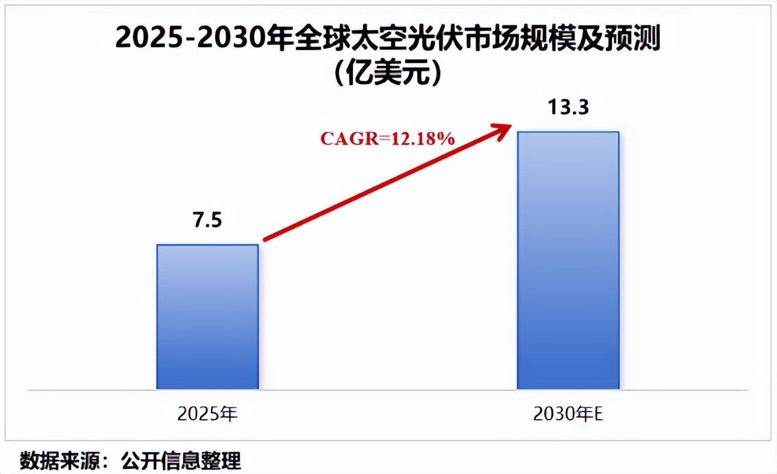 据预测,到2030年全球太空光伏市场规模将快速增长至13.3亿美元,年复合增长率达12.18%。
