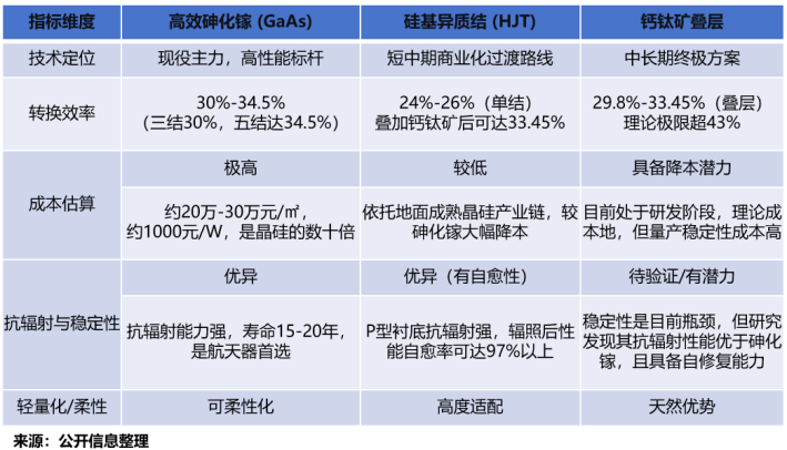 目前,太空光伏行业已形成“高效砷化镓→硅基HJT→钙钛矿叠层”的明确技术迭代路线。