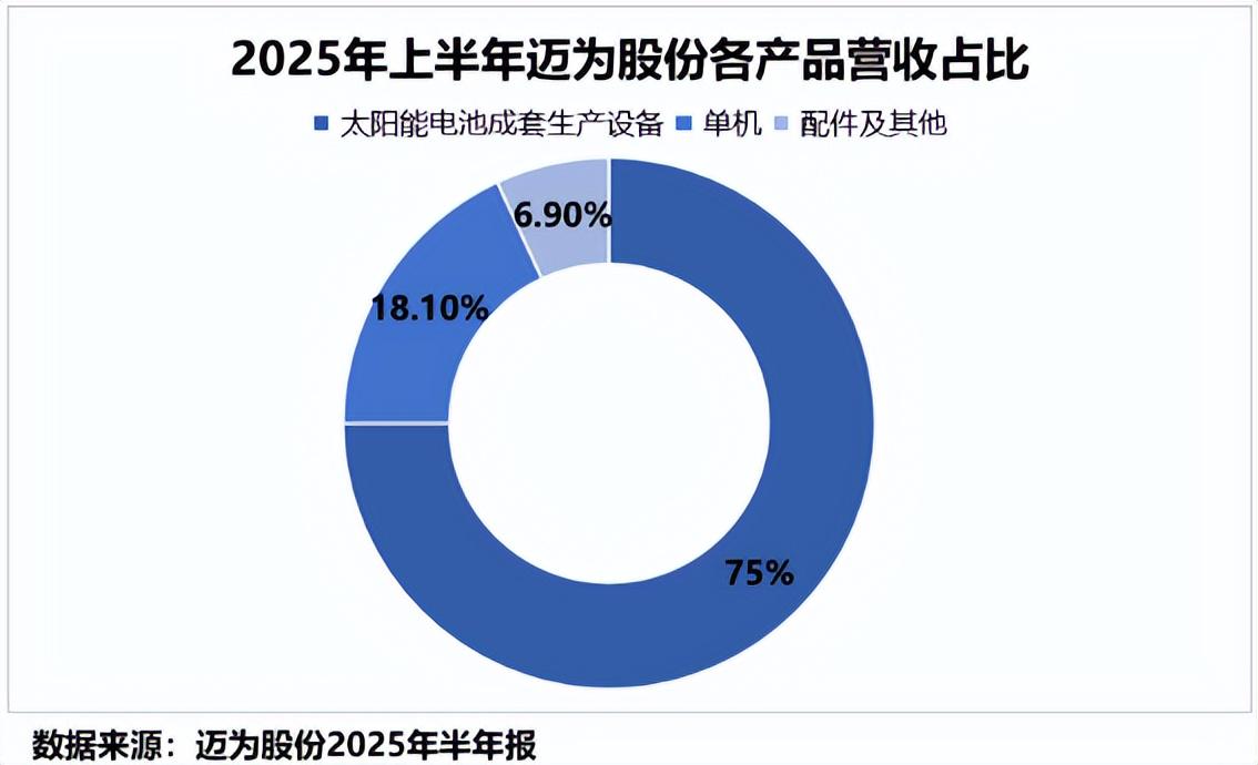2025年半年报显示,公司太阳能电池成套生产设备实现营收31.59亿元,占总营收的75%;单机设备实现营收7.63亿元,占18.1%。