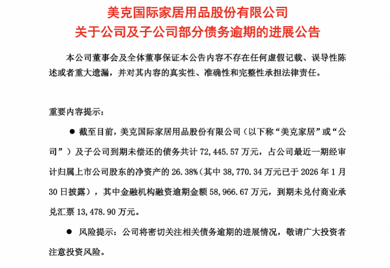 3月19日,美克家居(600337)发布公告称,公司及子公司累计逾期债务达到7.24亿元,占最近一期经审计净资产的26.38%。对比今年1月30日披露的3.88亿元逾期债务,仅47天内就新增逾期3.37亿元,债务风险呈现快速扩散态势。