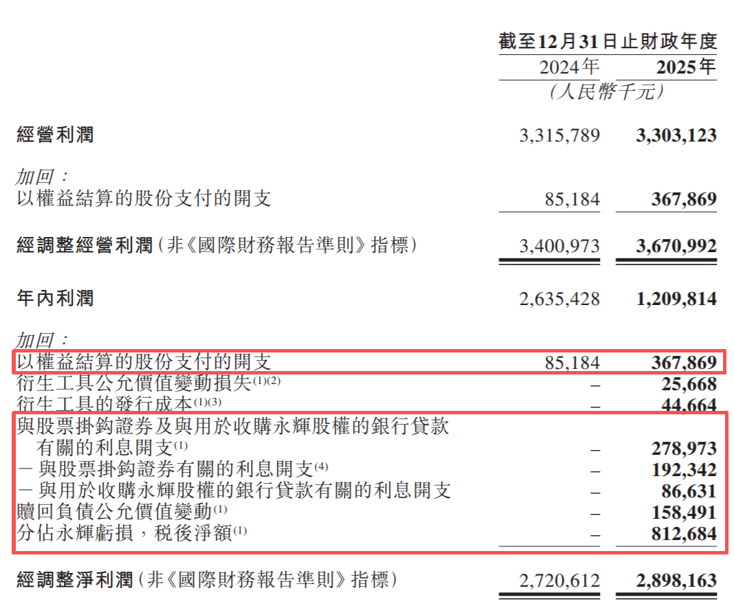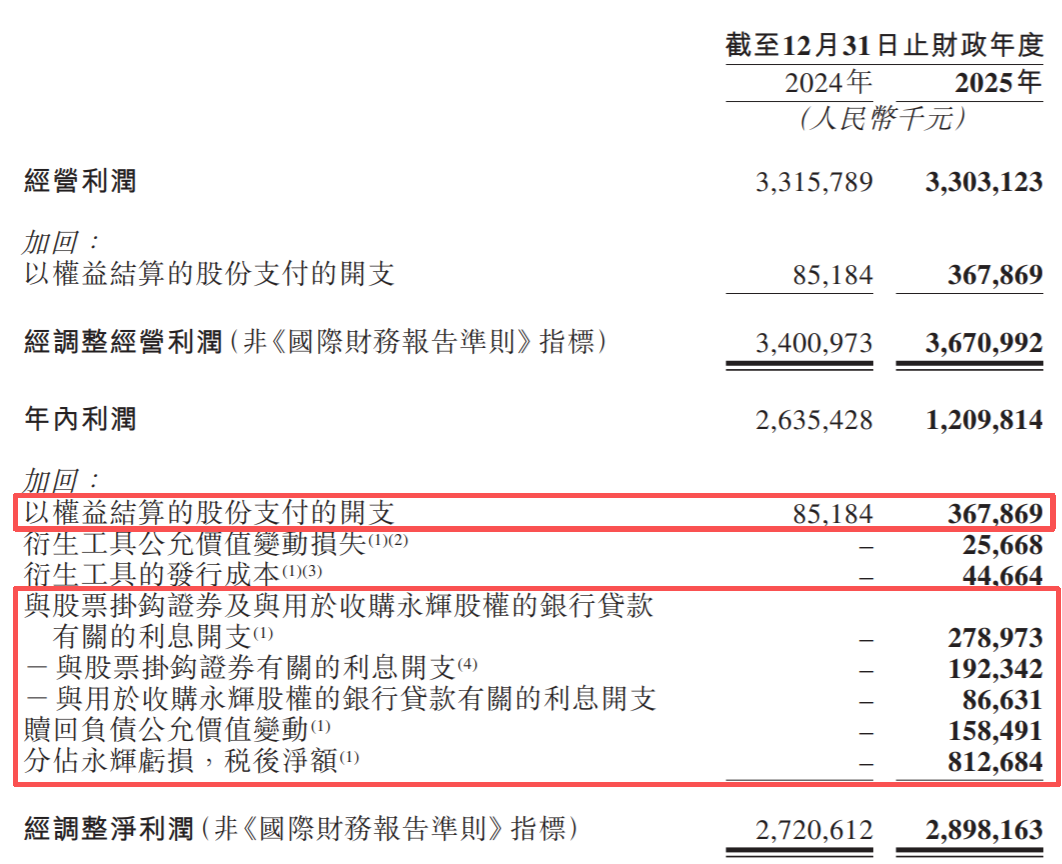 2025年,名创优品宣布分拆TOP TOY上市,并向TOP TOY的管理层跟雇员发行股份奖励,这部分经过会计处理,反应在报表上就是 以权益结算的股份支付开支3.68亿。