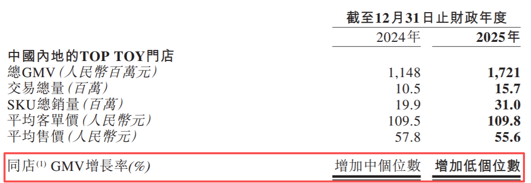平均客单价高达109.8元的TOP TOY,同店GMV增速也在放缓。