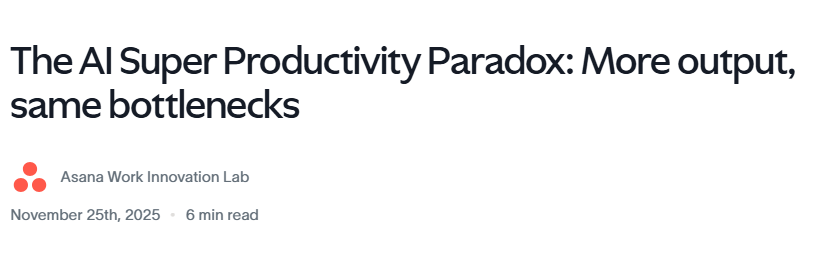 Asana旗下的Work Innovation Lab将这个现象称为“AI时代的超级生产力悖论”:个体的生产速率极速拉满,但组织消化和审批的“吸收速率”却依然停滞。他们在一篇《AI超级生产力悖论:更多的产出、相同的瓶颈》的文章分享了自己基于9000多名劳动者的调研结果:个体员工加快了产出,但组织系统保持不变——只有五分之一的组织在为AI重新设计工作流。