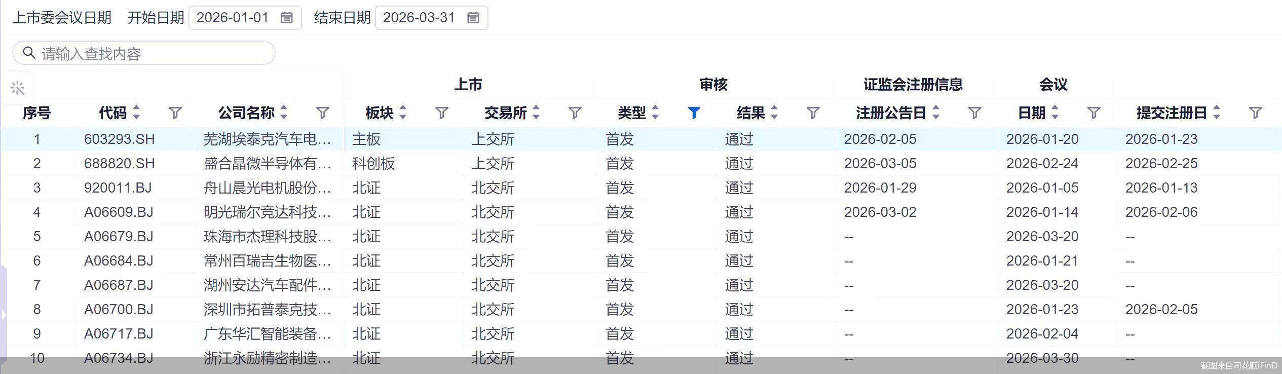 2026年一季度收官。经同花顺iFinD统计,伴随着欣兴工具、百英生物3月31日过会,今年一季度,沪深北交易所共迎来46家首发上会企业,远超上年同期的8家。从一季度上会企业整体情况来看,北交所IPO上会企业数量居首,共33家,占比超七成。IPO审核提速的同时,证监会批文下发也在加快。年内过会企业中,19家已顺利拿到证监会注册批文。