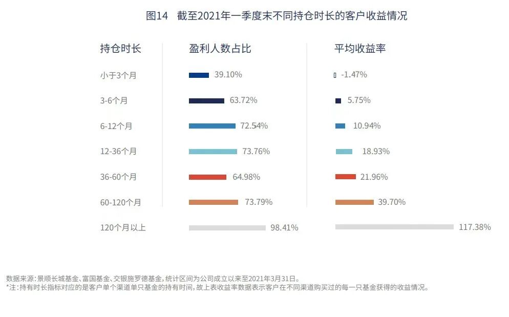 而 持仓超过10年时,客户盈利人数占比达到98.41%,平均收益率 达到惊人的 117.38%!