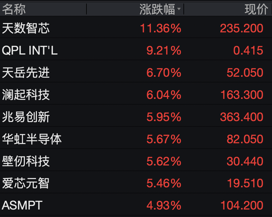 港股半导体股同样拉升,天数智芯涨幅扩大至11%,天岳先进、澜起科技涨超6%,兆易创新、华虹半导体涨超5%。