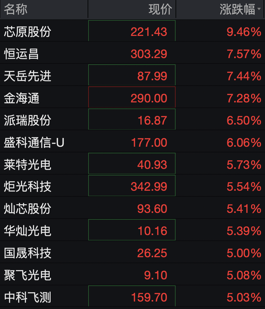 4月1日盘中,半导体板块持续走高,截至发稿,芯原股份涨超9%,恒运昌、天岳先进、金海通均涨超7%,派瑞股份、盛科通信涨超6%,莱特光电、炬光科技、灿芯股份等纷纷跟涨。