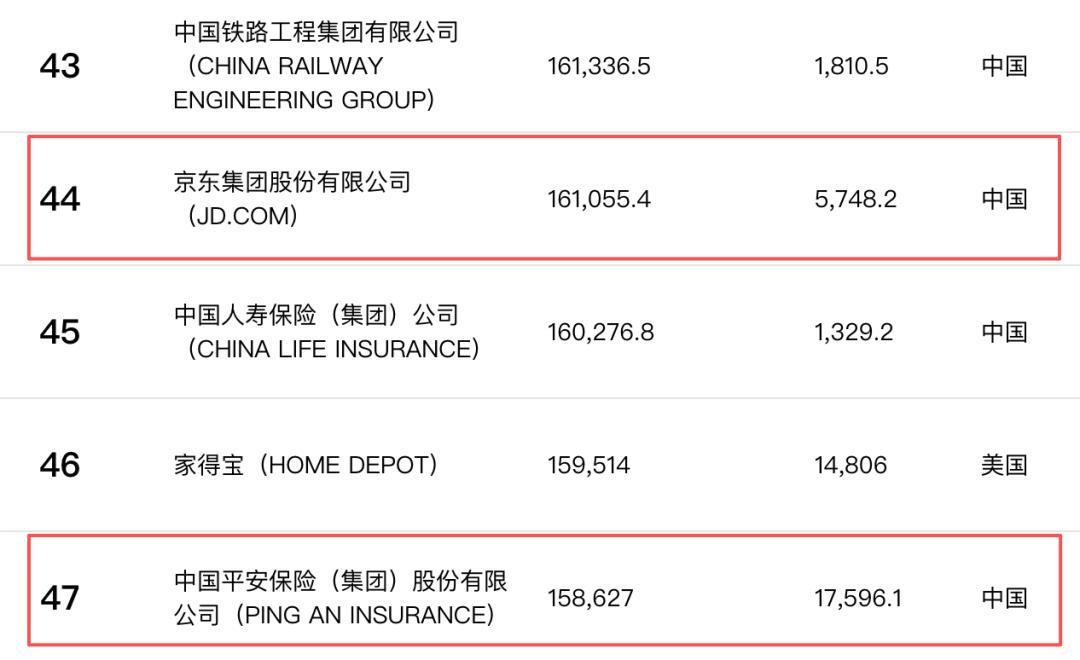 2025年《财富》世界500强排行榜显示,京东集团以营收1610.55亿美元位居第44位,中国平安以营收1586.27亿美元位居第47位。尽管中国平安营收不及京东集团,但其利润大约是京东的3.06倍。