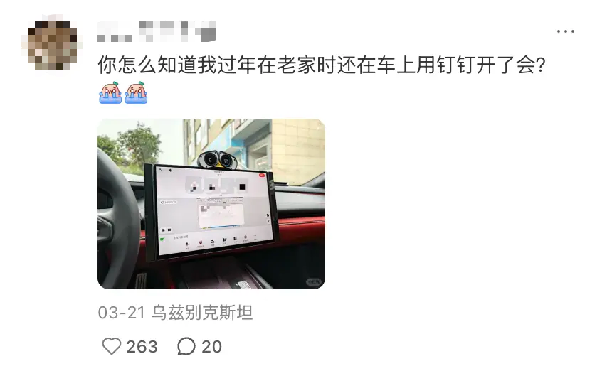 没想到,此帖一发出,评论区迅速变成“大型牛马聚集地”:有人晒出在车机上做的Excel表格,密密麻麻的数字铺满整块屏幕;有人在车里开起钉钉会议,那头老板的声音从音响里砸出来,实现真正的360度立体环绕;还有人直接给车机连上了鼠标、键盘、打印机,最后干脆支起小桌板,硬生生把汽车改造成了「带轮子的工位」。