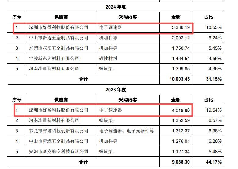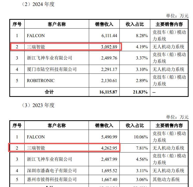 值得注意的是,公司前五大客户三瑞智能同时具备竞争对手身份,双方招股书披露的关联交易数据存在明显差异:好盈科技披露2023年、2024年向三瑞智能销售无人机动力系统金额分别为4262.95万元、3092.89万元,而三瑞智能披露同期从好盈科技采购电子调速器金额分别为4019.98万元、3386.19万元,两年份金额分别相差242.97万元、-293.3万元。这一数据差异未在双方招股书中得到合理说明,不仅反映出两家公司关联交易信息披露的严谨性不足,也对好盈科技IPO信息披露的准确性和完整性提出了疑问。
