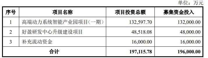 好盈科技拟募资19.6亿元,其中4.8亿元用于研发中心升级、13亿元用于高端动力系统产业园建设、1.6亿元补充流动资金。从公司当前发展现状来看,募资投向与现有研发、产能情况的匹配度,仍需进一步论证。