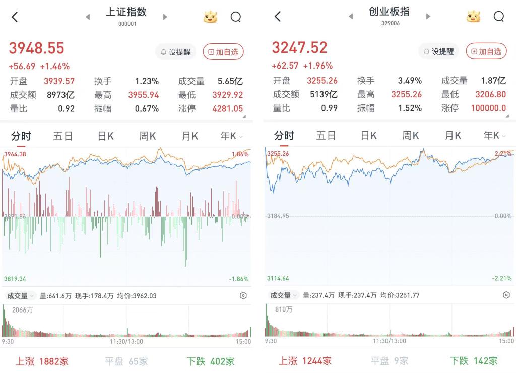 至收盘,上证综指涨1.46%,报3948.55点;科创50指数涨3.33%,报1298.2点;深证成指涨1.7%,报13706.52点;创业板指涨1.96%,报3247.52点。