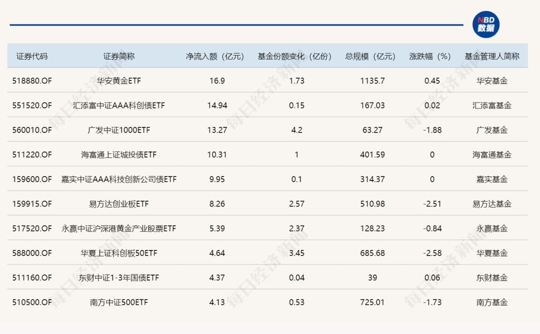 Wind数据显示,在3月31日的非货币ETF市场中,华安黄金ETF基金份额增加1.73亿份,净流入额16.90亿元;汇添富中证AAA科创债ETF基金份额增加0.15亿份,净流入额14.94亿元;广发中证1000ETF基金份额增加4.20亿份,净流入额13.27亿元。