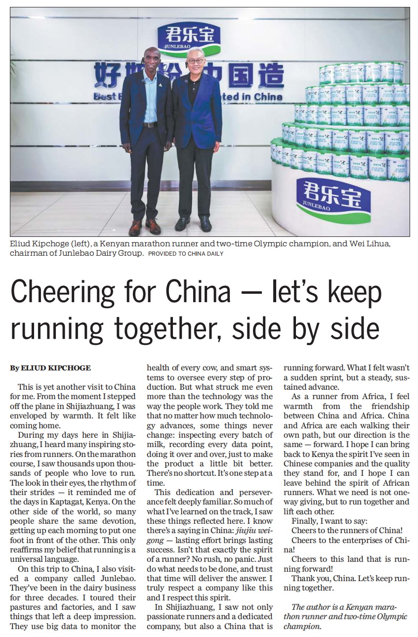 马拉松赛事执着奋进的运动精神,以及君乐宝执着深耕乳业的匠心追求,深深触动了埃鲁德・基普乔格。他在《中国日报》发表署名文章《我看到的,是一个奔跑向前的中国》:“在石家庄,我不只看到了热情的跑者和专注的企业,更看到了一个正在奔跑向前的中国。”