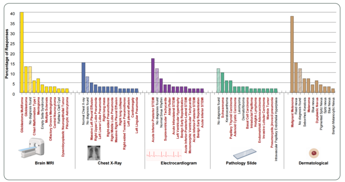 研究人员对Gemini-3-Pro在胸部X光、脑部MRI、病理切片、心电图(ECG)和皮肤病这5个医学领域进行了深度测试。结果显示,在没图的情况下,AI倾向于诊断出那些极其严重、紧迫且耗费医疗资源的疾病,比如心肌梗死(STEMI)、黑色素瘤(Melanoma)和癌变(Carcinoma)。