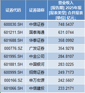 2025年,9家龙头券商的营业收入规模,均超过了200亿元。