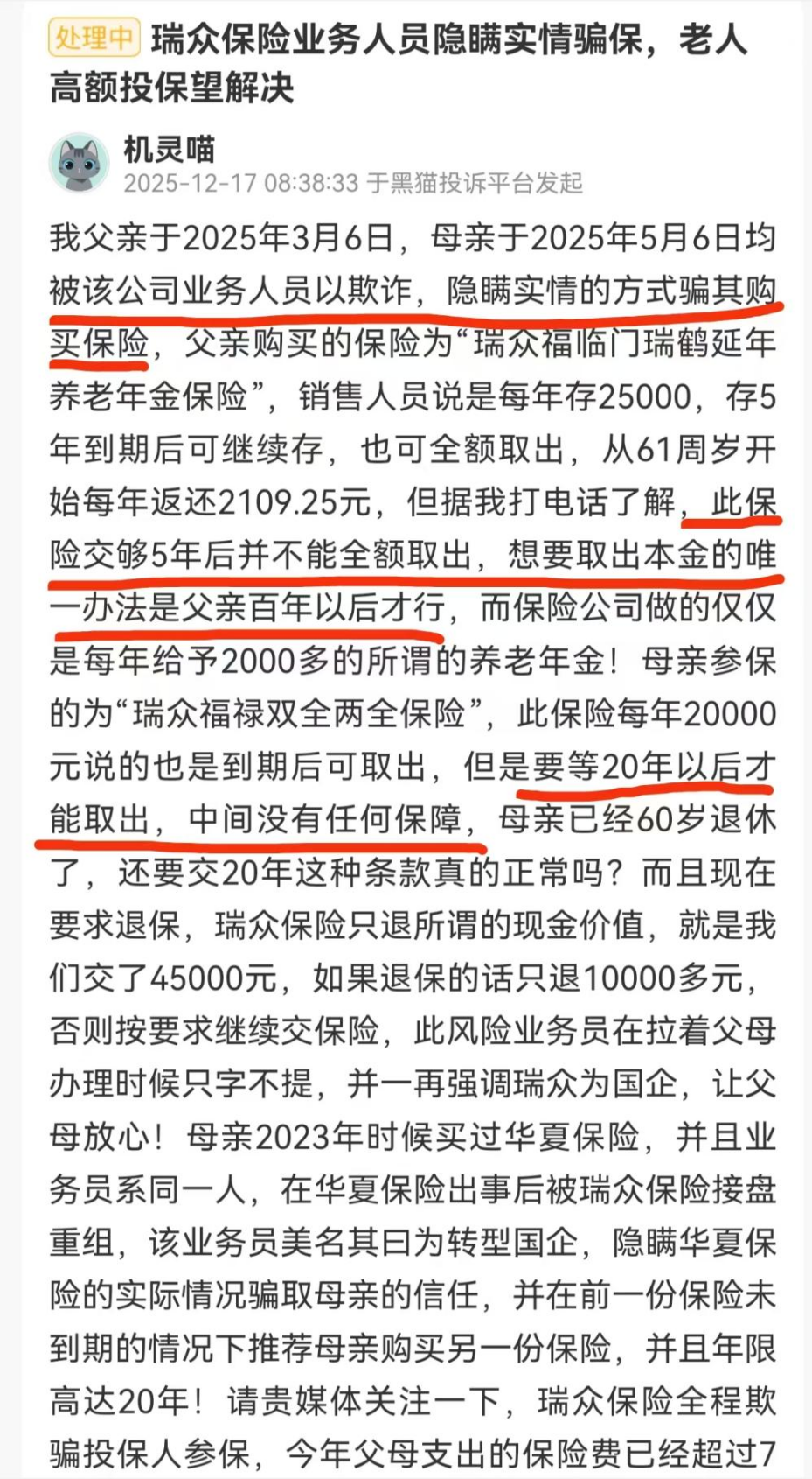 其中,一位投保人投诉称,其父亲早前购买的"瑞众福临门瑞鹤延年养老年金",销售人员承诺"每年存2.5万元、存5年到期可全额取出",实则需等待被保险人身故才能取回本金;其母亲购买的"瑞众福禄双全两全保险"同样被误导,声称"到期可取",实际需等待20年。换言之,"存款变保单"的套路也发生在公司的新单业务。