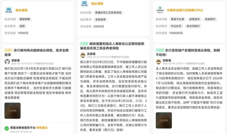 另一位投保人则反映,早前在邮储银行某营业所存款时,被工作人员诱导购买养老年金保险,"双录"期间甚至被要求全部回答"对"。此外,还有人反映在农业银行贷款26万元时,被客户经理强制绑定购买瑞众保险产品,贷款结清后退保无门。