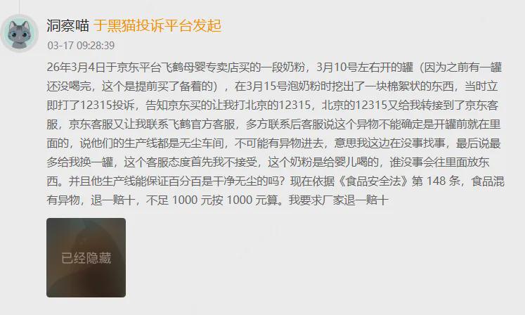 这是一位消费者在黑猫投诉平台上的投诉。同样令她失望的是,她说,当她联系飞鹤客服时,得到的回复却是:“我们的生产线都是无尘车间,不可能有异物进去”——言下之意,消费者在“没事找事”。
