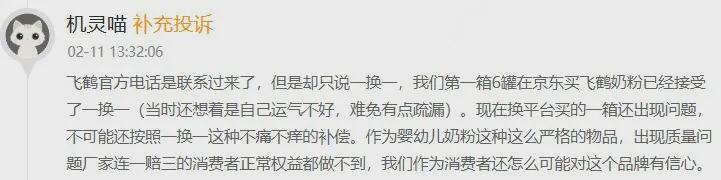 面对投诉,飞鹤官方的处理方式呈现出惊人的一致性:即“一换一”的解决方案——只换有异物的那一罐,其他“正常”的不予处理。