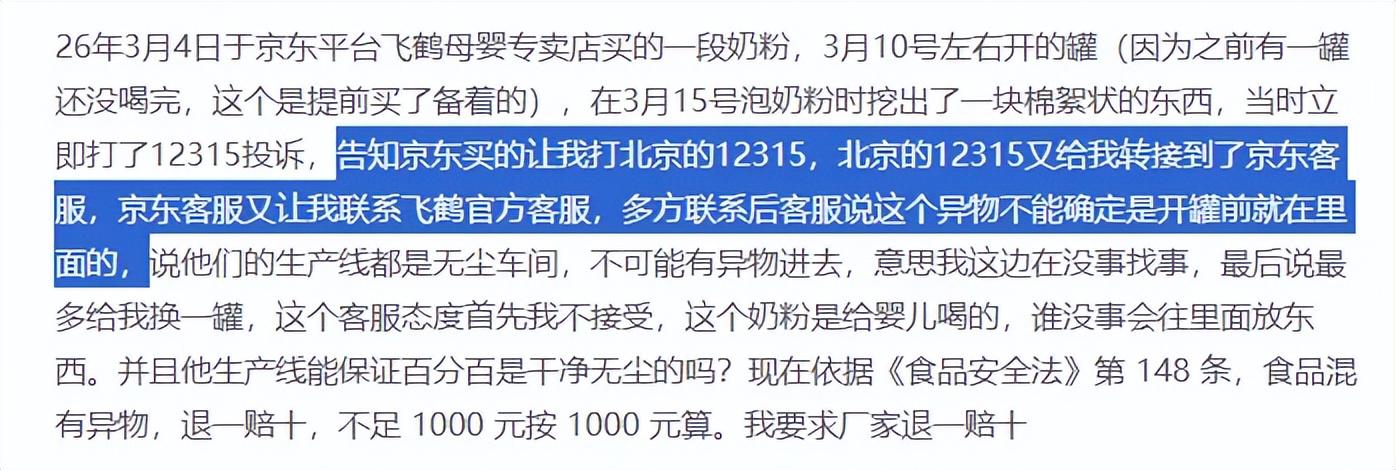 新商悟分析师注意到,消费者的维权之路并不顺畅。以一位投诉者的经历为例:打了12315投诉,被告知“京东买的让我打北京的12315”;北京的12315又转接到京东客服;京东客服又让联系飞鹤官方客服……一圈下来,问题依旧悬而未决。