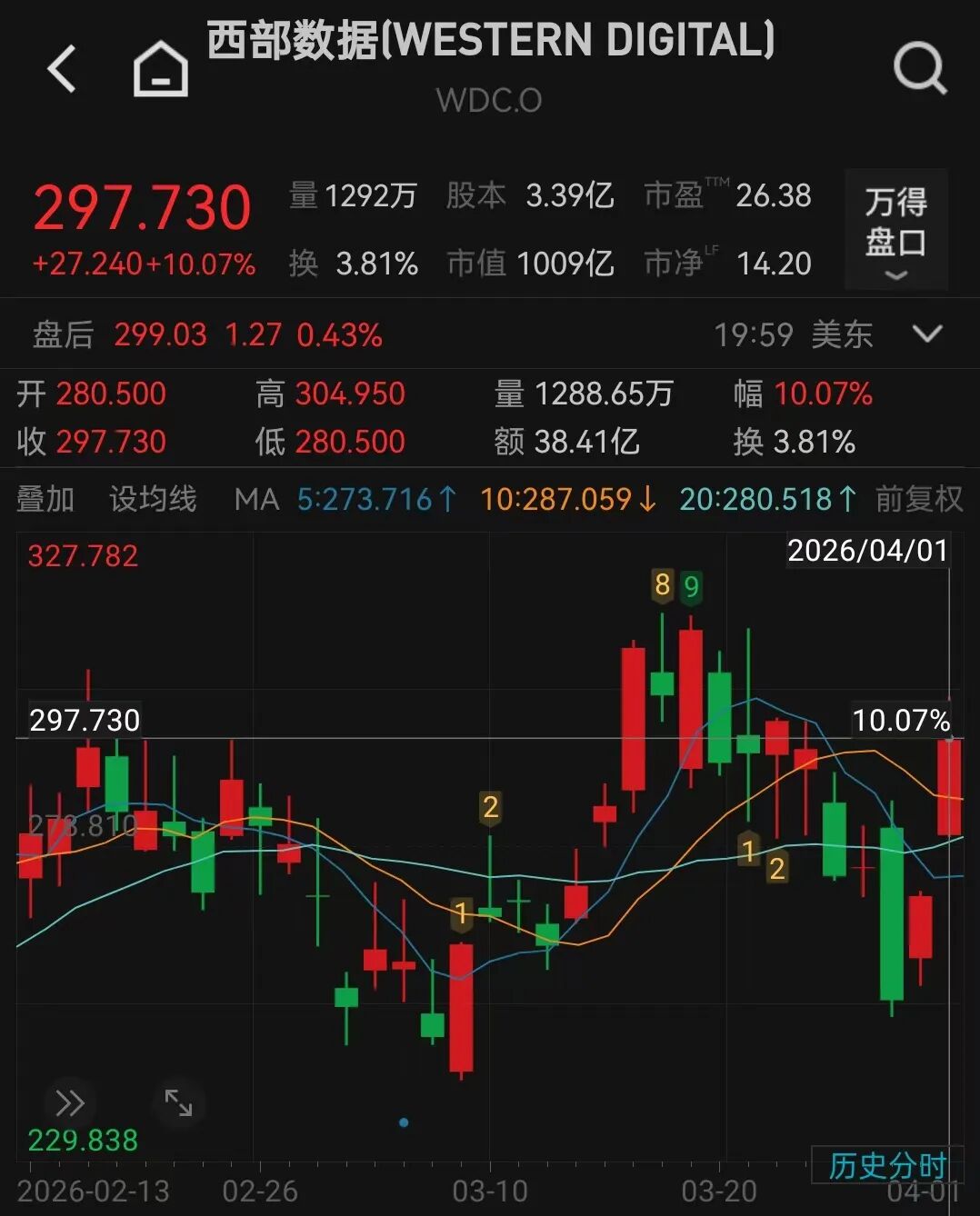 3月26日至3月30日,美光科技(MU.O)股价累计下跌15.74%,闪迪(SNDK.O)跌15.54%,西部数据(WDC.O)跌15.02%,希捷科技(STX.O)跌12.29%。但近两日涨幅已基本抵消了这4只美股存储股3月26日至3月30日的跌幅。3月31日,美光科技股价涨4.98%,闪迪涨10.98%,西部数据涨7.48%,希捷科技涨8.09%,4月1日,这四只个股又分别涨了8.88%、9.03%、10.07%、8%。