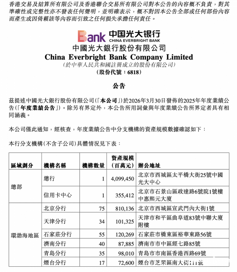 4月1日晚,光大银行在港交所发布公告,经核查,该行对分支机构的资产规模数进行了确认。从这份公告公布的数据上看,该行对此前在港交所发布的数据进行了变更,变更后的数据与在上交所发布的业绩报告内数据保持一致。