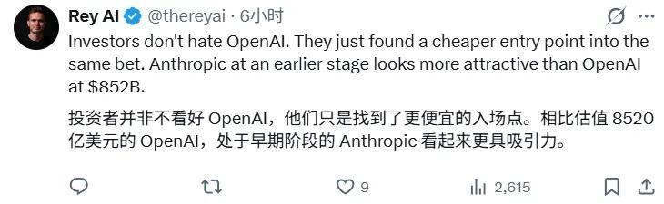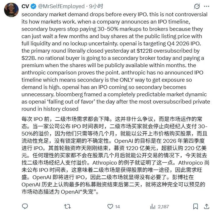 另一类更偏市场视角的解释则更「冷静」:如果 OpenAI 的 IPO 已有明确时间预期(例如 2026 年),那么理性的投资者自然会减少在二级市场以高溢价买入的动力,转而等待公开市场直接参与。相比之下,Anthropic 尚未给出清晰的上市路径,二级市场几乎是唯一入口,需求自然更集中。