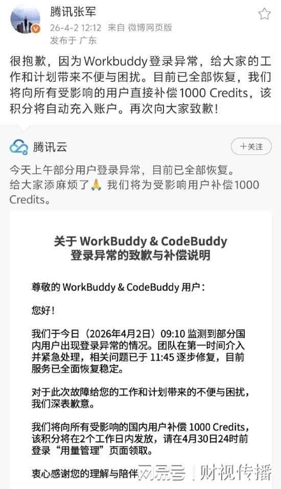 随后,腾讯WorkBuddy&CodeBuddy团队发布官方说明称,系统于当日9:10监测到部分国内用户登录异常,技术团队已第一时间介入处理,并于11:45起逐步完成修复,目前服务已全面恢复稳定。
