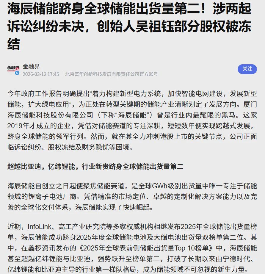 这下好了,全球老二的位子还没坐稳,应付官司就够海辰储能焦头烂额一阵子的。