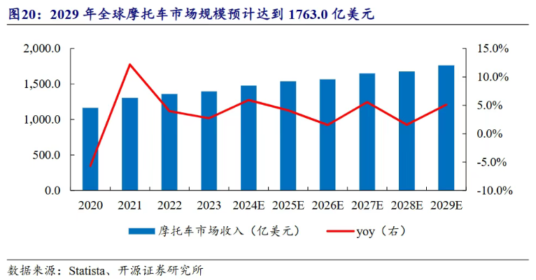 近年来,全球摩托车销量稳步提升。根据Statista数据,2024年全球摩托车销量约为5680万台,同比增长4%;预计2029年全球摩托车销量将达6280万台。市场空间方面,2024年全球摩托车市场规模为1479亿美元,2029年预计达到1763亿美元,2020—2029年期间复合增长率为4.7%。