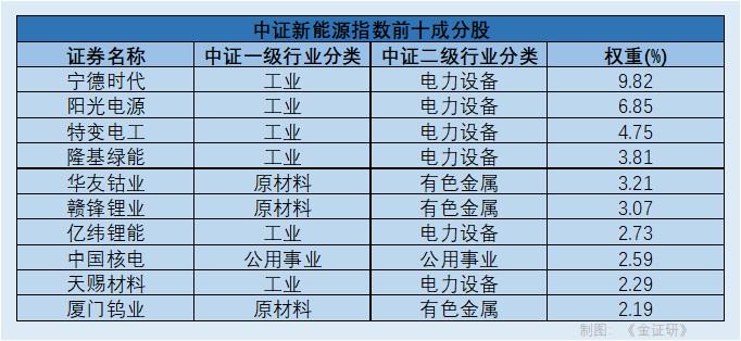 截至2026年4月1日,中证新能源指数前十成分股为宁德时代、阳光电源、特变电工、隆基绿能、亿纬锂能、华友钴业、赣锋锂业、中国核电、金风科技、三峡能源。