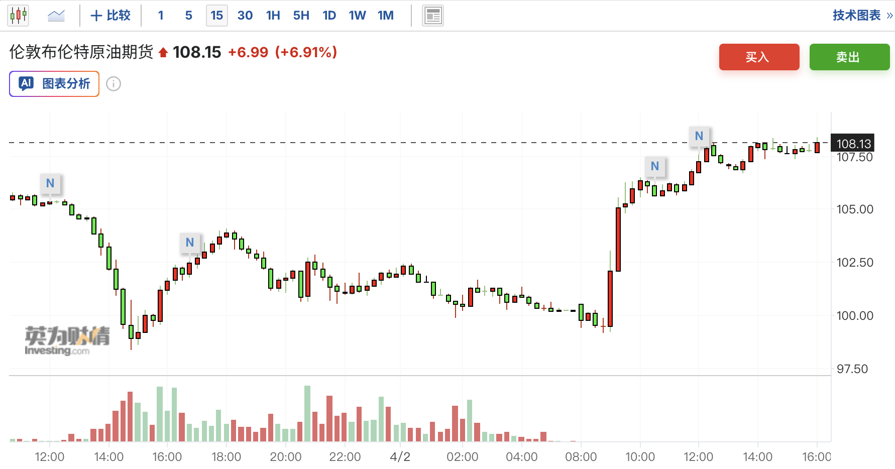 特朗普讲话后,布伦特原油期货应声上涨约7%,一度触及每桶108美元,美股期货下跌超1%,欧股跌幅超2%,亚太主要股指几乎全线飘绿。