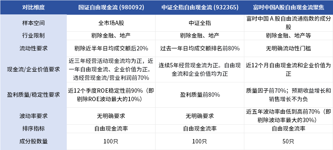 一个重要的共同点:这三只指数都剔除了金融和地产行业,三大指数均每季度调整一次指数样本。因为银行、保险、地产公司的现金流模式比较特殊(比如银行的存款是负债,不是现金流入),用同一套标准来衡量容易失真。这一点跟红利指数也不一样,红利指数通常不剔除金融地产。