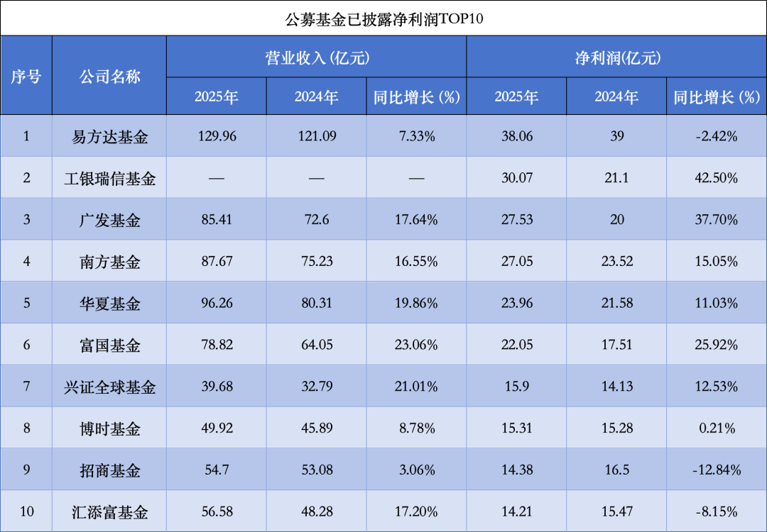 截至4月1日,有超过40家基金公司披露了2025年经营数据,其中,具有可比数据的公司超七成实现净利润的同比增长。净利润TOP10的头部基金公司,2025年共实现228.52亿元净利润,对比上年同期增长约12%。