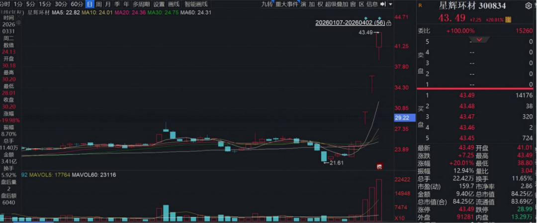 4月2日,星辉环材股价20CM涨停,收盘时股价升至43.49元/股,总市值达到84亿元。自3月31日以来,公司股价连续三个交易日涨停,累计涨幅达72.79%。