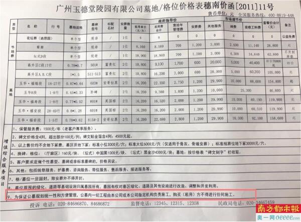 南沙玉德堂陵园的收费清单进行了“明码标价”,但消费者无议价和选择空间。