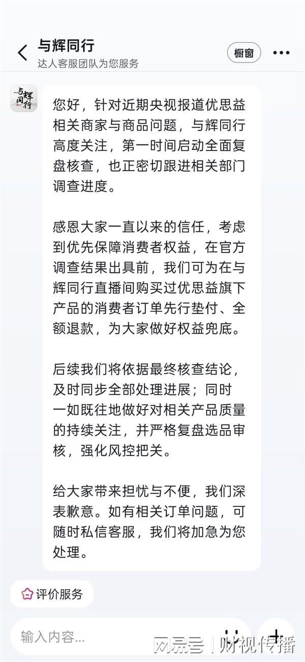 4月2日,针对央视曝光的“澳洲优思益”虚构海外产地、伪造品牌背景一事,与辉同行作出正式回应。与辉同行表示,已第一时间启动全面复盘核查。“感恩大家一直以来的信任,考虑到优先保障消费者权益,在官方调查结果出具前,我们可为在与辉同行直播间购买过优思益旗下产品的消费者订单先行垫付、全额退款,为大家做好权益兜底。”同时,与辉同行就事件带来的担忧与不便致歉,并承诺后续将依据最终核查结论同步处理进展,强化选品审核与风控机制。
