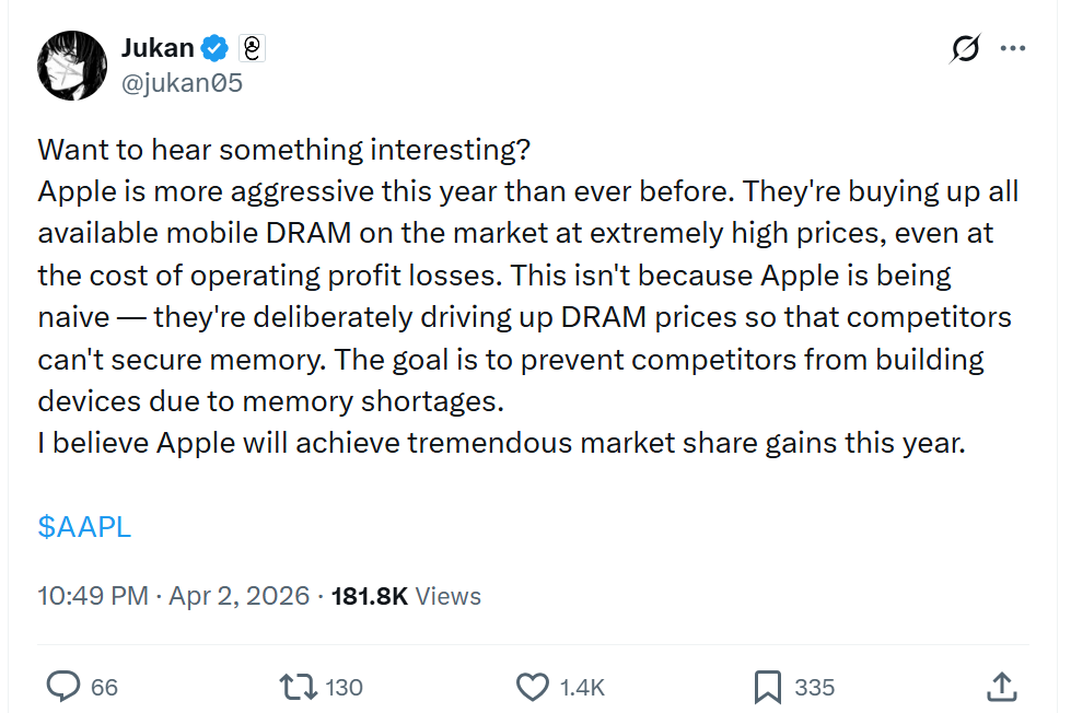 相比之下,苹果若能凭借提前锁定的大量库存或以规模摊薄高价采购成本,将在短期内具备维持产品定价稳定的相对优势,进而在与三星等主要竞争对手的市场争夺中占据有利位置。