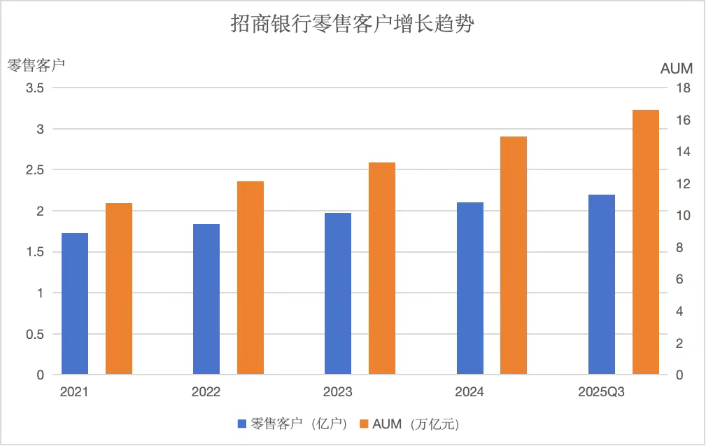 而回到零售银行的基本盘,招行的零售客户数、金葵花及以上客户数以及AUM规模持续保持正增长和行业领先规模。截至2025年三季度末,其零售客户数较年初增长4.8%至2.2亿户,AUM较年初增长11.2%至16.6万亿元。