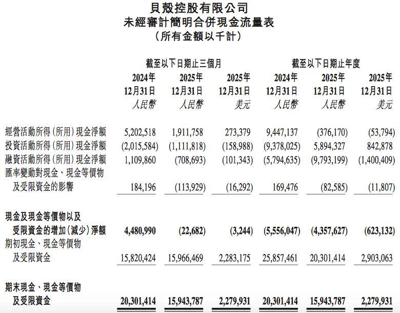 经营现金流由正转负,2025年贝壳经营活动现金流净额-3.76亿元,同比暴跌104%,为近年罕见。主要原因是租赁业务房源托管、前期垫资占用大量资金,叠加房产交易佣金回款速度放缓,导致企业现金流紧张。截至2025年末,公司现金及现金等价物159.4亿元,较年初减少43.6亿元,短期偿债压力与资金周转压力显著上升。