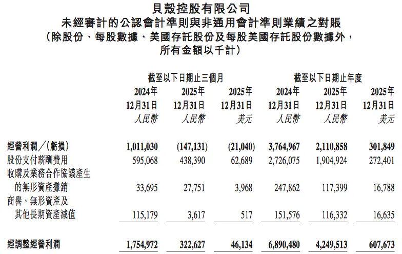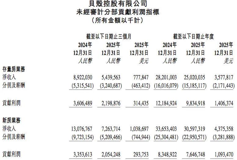 就在这场变革落地两周前,贝壳刚刚交出2025年全年成绩单:净收入946亿元,同比微增1.2%;净利润29.91亿元,同比下降26.7%,经调整净利润50.17亿元,同比下降30.4%,双双大幅下滑;毛利率从24.6%滑落至21.4%,四季度更现净利润同比暴跌85.8%至0.82亿元的“断崖式”下滑。