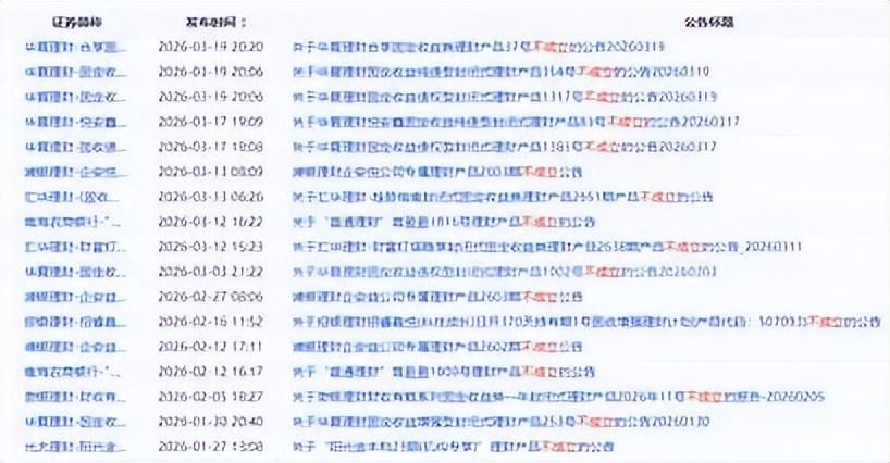 在这场发行失败的寒潮中,华夏理财、浦银理财、 苏银理财等多家银行理财公司相继发布公告,宣布旗下部分理财产品因“募集规模未达成立下限”而发行失败。深入了解后不难发现,这些失败的产品类型,均为固定收益型理财,且运作模式多为封闭式净值型产品,风险等级主要集中在中低风险及低风险区间。
