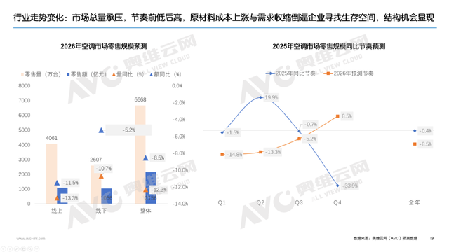 据奥维云网(AVC),2025年中国家用空调总销量同比下降1.3%,中端价格段份额持续收窄,低端价格段竞争白热化,考虑到国补台量收缩、前期市场透支效应、地产行业持续调整,预计2026年国内空调零售市场销额达 2156亿元,同比下降8.5%,销量同比下降12.3%。