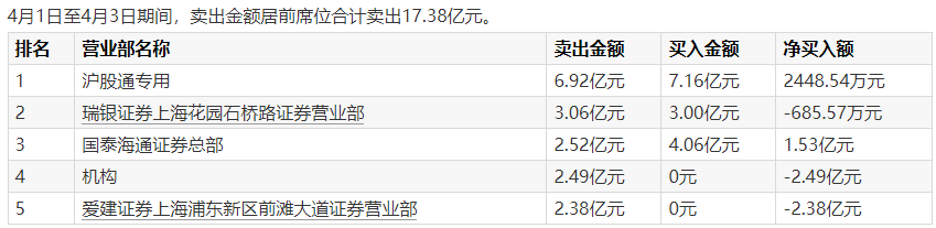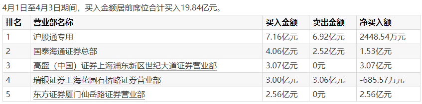Wind龙虎榜数据显示,4月1日至4月3日期间,上榜营业部席位合计成交37.22亿元,其中买入金额为19.84亿元,卖出金额为17.38亿元,合计净买入2.47亿元。