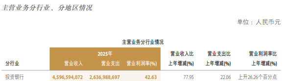 分业务板块来看,2025年中金公司主营业务多点开花,投资银行与股票业务板块增幅最为显著。报告期内,投资银行分部实现营业收入45.97亿元,同比大幅增加77.95%。