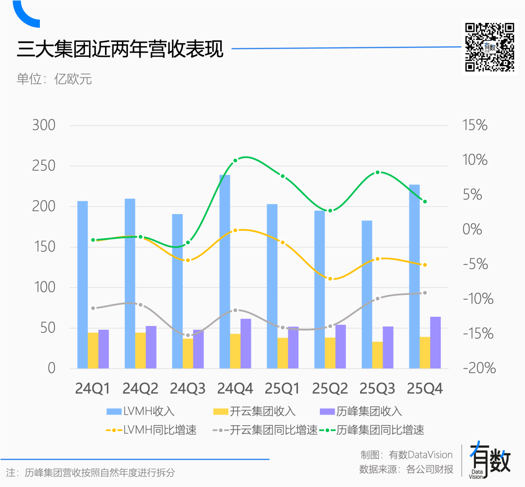 2025年,LVMH营收同比下降5%,开云更惨,直接下滑了13%。唯独历峰逆势增长,虽说6%的增幅不算多,但胜在有同行衬托。