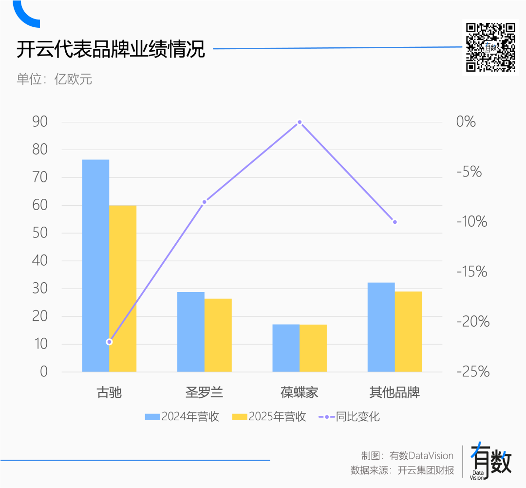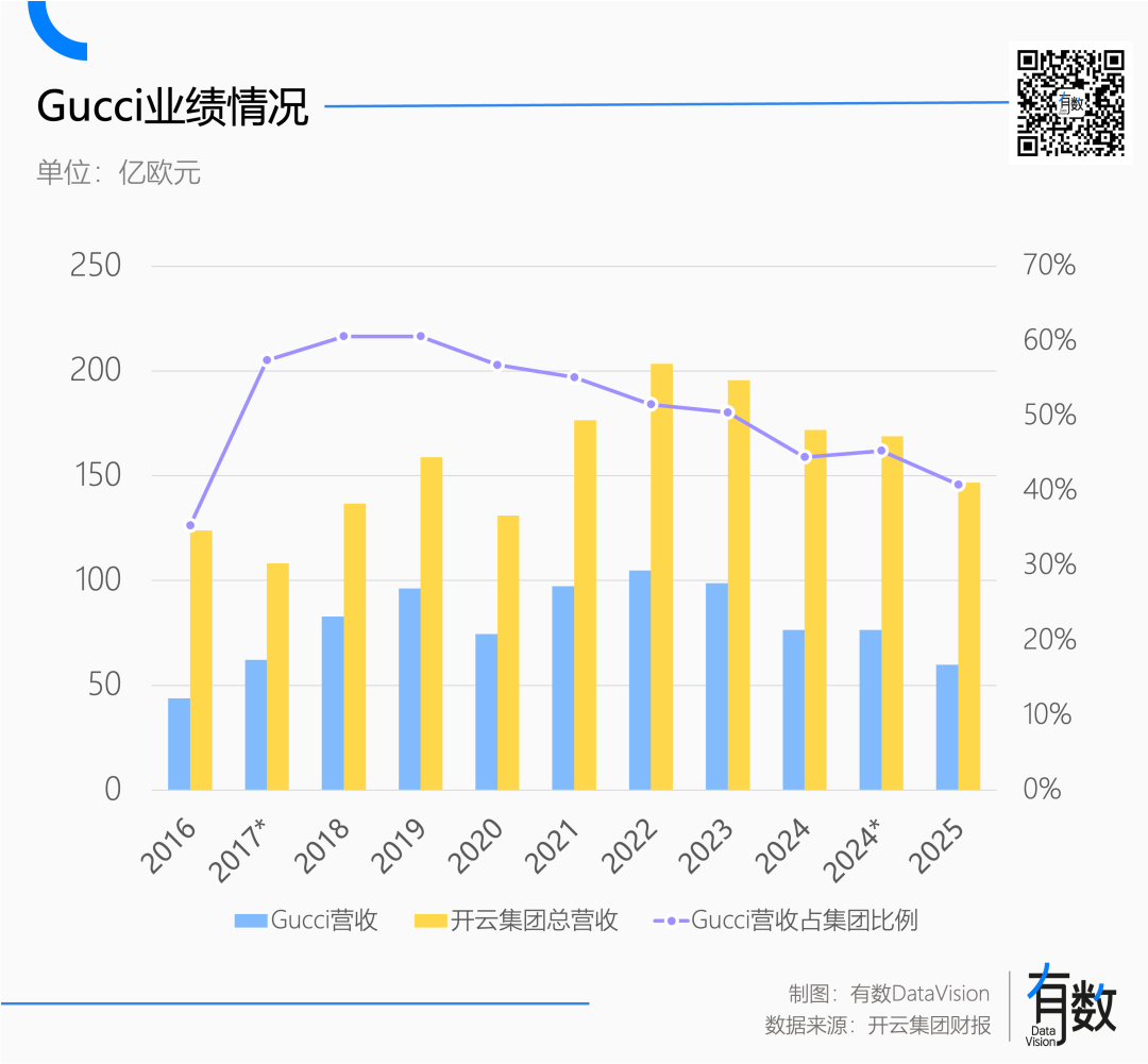 和LVMH类似,Gucci扛起了开云40%的营收。结果2025年,Gucci营收下降22%,营业利润大跌40%[4],整个集团翻船。