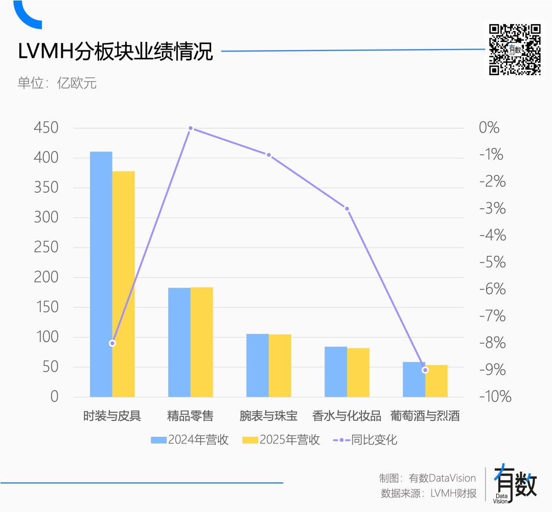 按照财报口径,营收占比近半时装与皮具板块一直是LVMH的顶梁柱,包含LV、FENDI、Dior、日默瓦等品牌,也是集团营收下滑的主因。