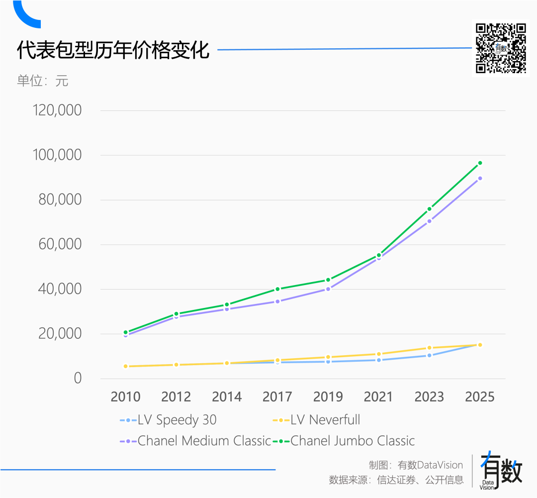 一是过度涨价透支了品牌知名度。过去几年,面对市场波动,各大品牌不约而同地选择疯狂涨价。以香奈儿为代表,经典款CF十年涨幅约200%。